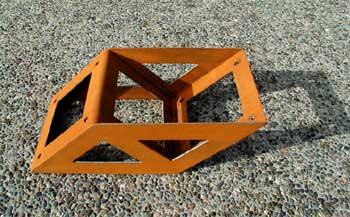 Modular sculpture consists of identical individual units joined together. The number of units or modules may be varied and the relative orientation of individual units my be varied. Additionally, the assembly of modules may be mounted in a variety of orientations, from vertical to horizontal, depending on the requirements of a particular installation. Another variation would consist of arrays of modules, e.g. two or four 12X Small Helix assemblies mounted on a common base with the helices intertwining. This allows for a very large number of possible final sculptures and resulting esthetics. Currently, the only work available is the Parallelogram Module Series. The individual modules (see picture above) consist of two side plates of a parallelogram profile joined by a 'Z' plate formed so that each plane of the 'Z' is at a right angle to the others. Both side plates and 'Z' plates contain cutouts to enhance the appearance and shadow profiles of the sculpture. All modules are constructed from 10 gauge Cor-Ten steel (weathering steel) which is sheared (basic profiles), plasma cut (cutouts), punched (mounting holes), formed (bends), seam welded, welds ground flush and the assembly sand blasted to remove mill scale. Rusting is then initiated by a water spray over several days to create the patina. The initial bright orange color is likely to change slowly over time, most likely toward a dried blood rust color, although there is limited long term experience to base expectations upon. Individual modules are joined together by four stainless steel studs with stainless Acorn nuts. Finished sculptures require a solid mounting point in most installations, either existing slab or wall or heavy freestanding base. Sculptures may be freestanding horizontally in natural repose, mounted vertically or mounted horizontally, projecting from a solid vertical surface. Some installations may require an angle adapter module to achieve the desired orientation.