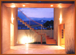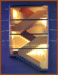 A relatively conventional zigzag stair brought to life with dramatic lighting and showcased in large window. Note extension of step form through wall below window. |