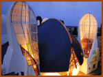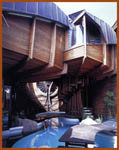 This contemporary stair has balusters like the ribs of a whale. Stairs and fireplaces/ chimneys are the fixtures most used in western architecture for free expression of design. |