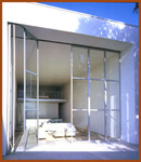 Stacking glass wall. Not as exotic a solution to opening rooms to the outdoors as the Soleri design above, but more practical. Also could be used with insulation. |